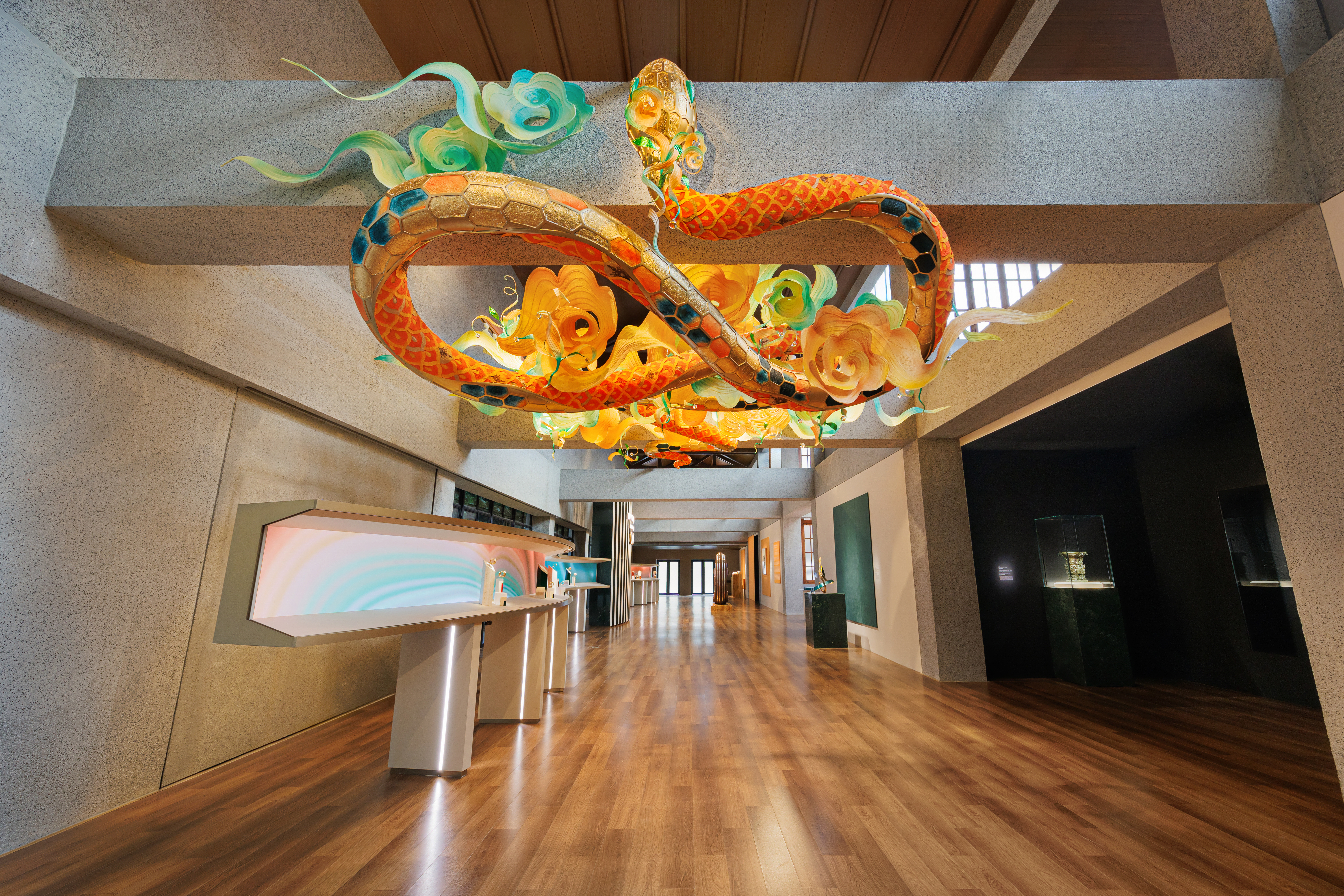 宝格丽“Serpenti Infinito灵蛇·生生不已”蛇年特展共展出19位中外艺术家创作的28件艺术作品,其中11件为此次展览特别创作。该展览邀请观众一同探寻灵蛇在艺术、历史与当代创意领域的无尽蜕变和焕新演绎,揭示其所承载的多重寓意。展览期间,雷菲克·安纳多尔(Refik Anadol)的3D雕塑作品《灵蛇幻境》(Infinito: AI Data Sculpture)在一个360度镜面空间的中央进行了预展。