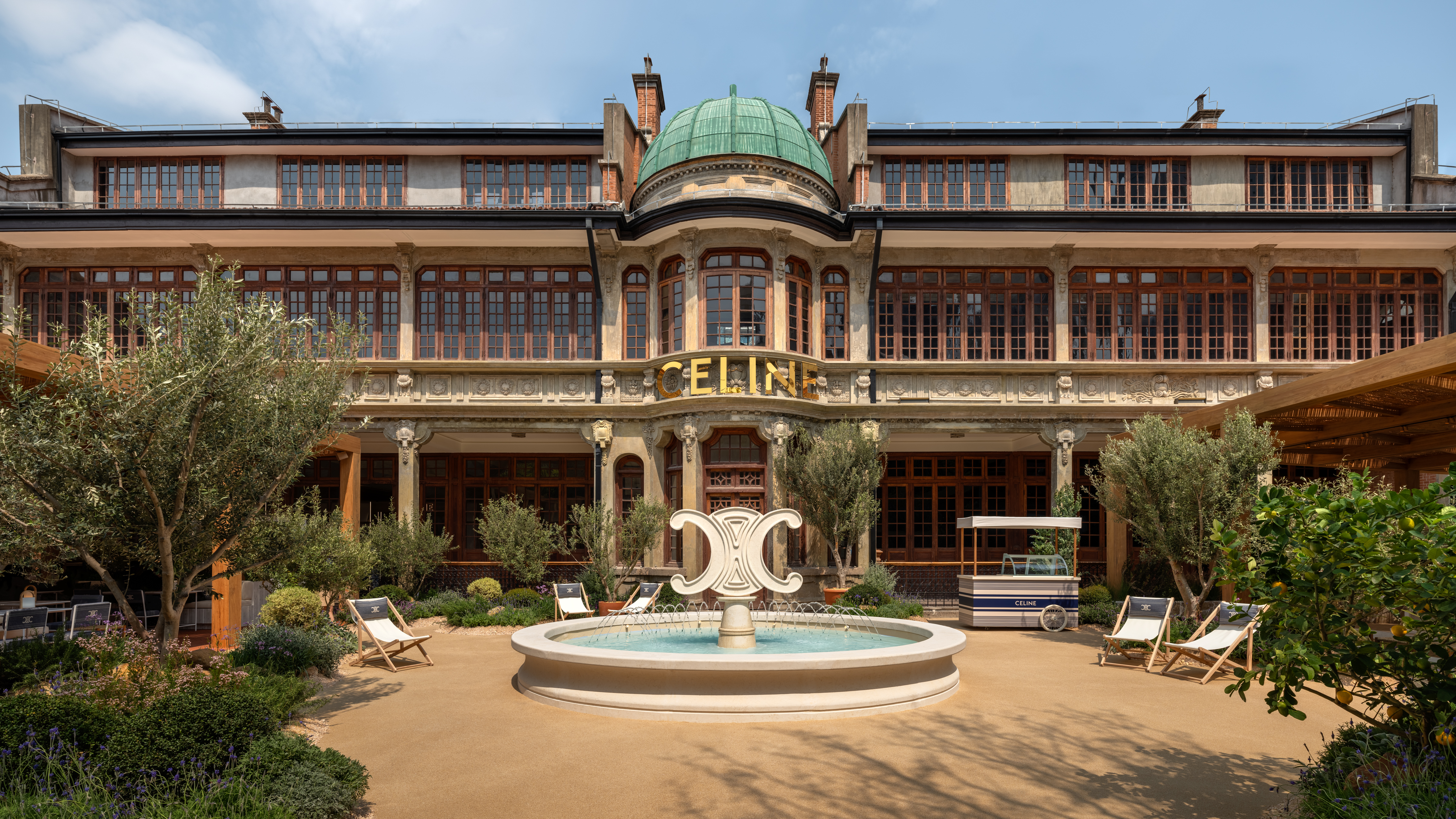 此次原创活动的构想在于打造一个真正值得居住或探访的目的地,致敬温暖夏日与漫长夏夜的慵懒户外时光与悠然步调。精致的庭院中,CELINE精心打造了三个独立区域,生动演绎CELINE诠释的法式夏日风情。一片绿意盎然的花园,地中海植被围绕着庭院中央的喷泉,而喷泉之上,CELINE代表性的Triomphe标识雕塑优雅矗立。花园一侧,细腻的沙地构成天然的游乐场,邀请宾客体验芬兰木棋游戏(Finnish keels),或感受蔚蓝海岸代表性的法式滚球(Pétanque)游戏。紧邻游戏场地,一辆别致的冰淇淋车静候一旁。与之相对的另一侧,则是一方优雅的露台休憩区与咖啡馆,重现法国人热衷流连的露天咖啡座氛围,空间以定制木质遮阳装置覆盖,地面则铺设人字纹地板。