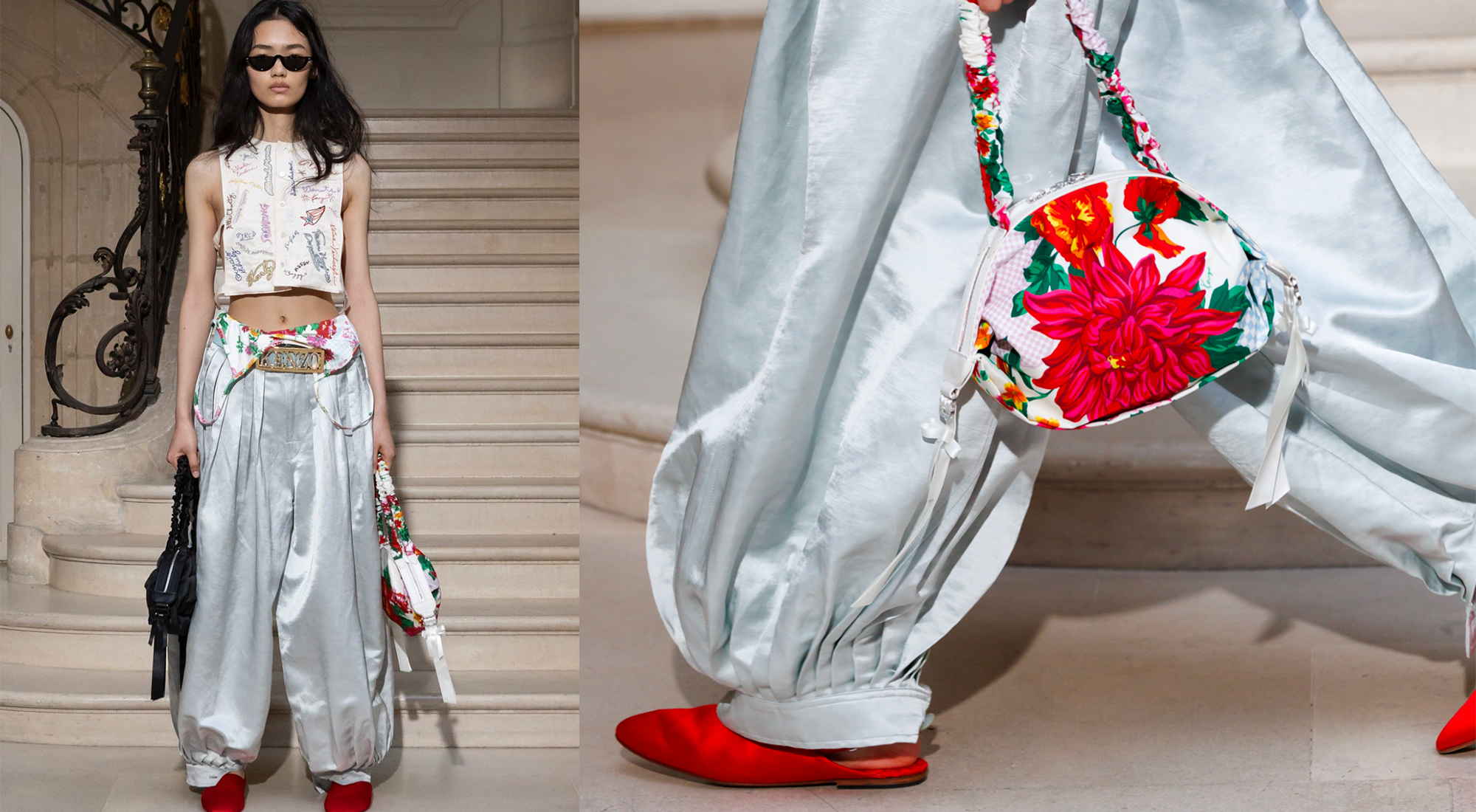 NIGO的个人收藏为本季剪裁风格带来灵感,注入一丝随性魅力。双排扣晚礼服外套与丝质飞行员夹克、羊毛毡连帽衫相得益彰。日式丹宁裤的锁边工艺赤耳饰以粉色,轻盈面料的宽松灯笼裤若隐若现地展露腿部线条。吊带背心上充满奇思妙想的花卉图案则源自KENZO时装档案中的泳装设计。配饰同样洋溢着少女的灵动与浪漫,包括配有褶皱手柄和精致丝带蝴蝶结的包袋。