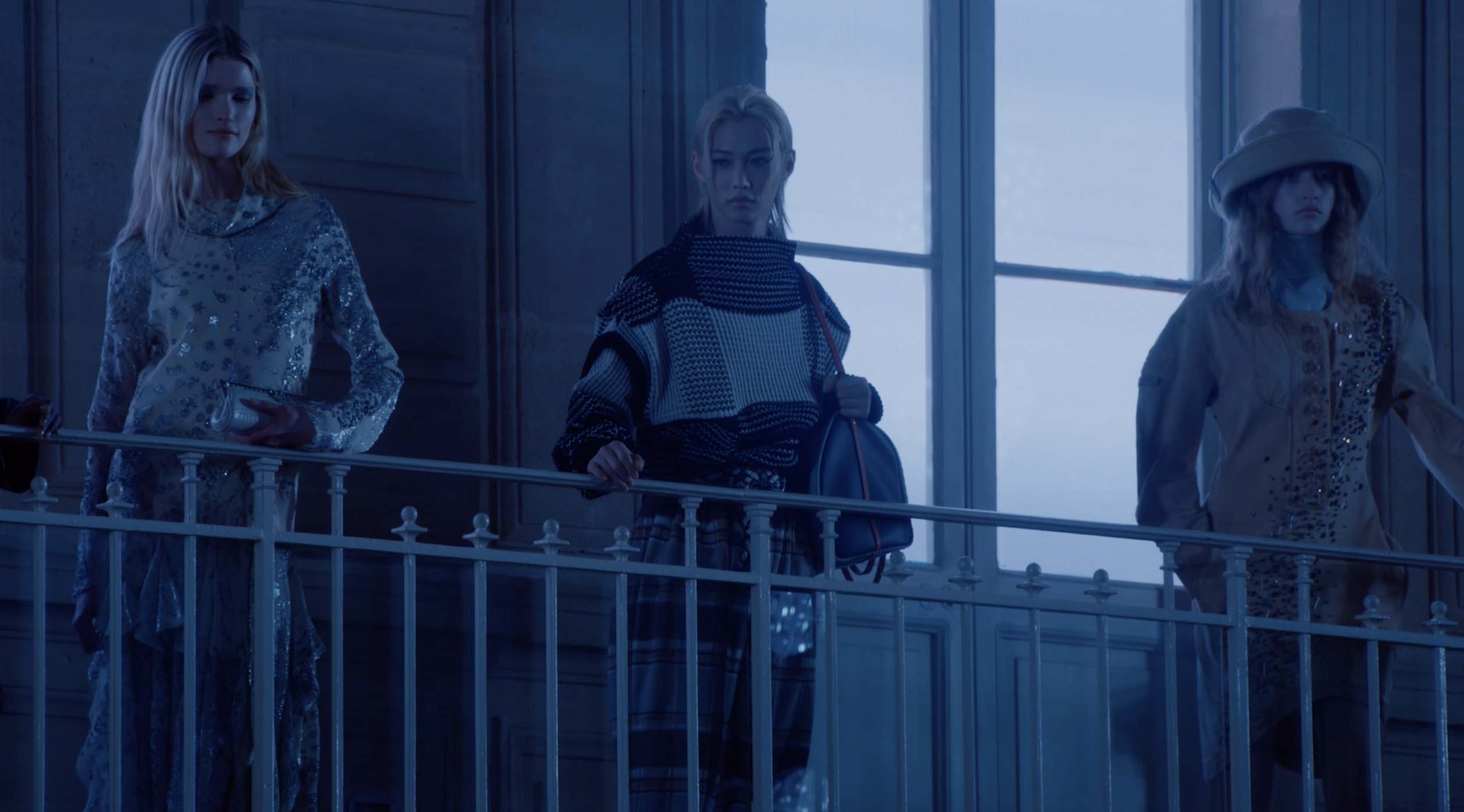在毗邻巴黎北站的北方之星(L’Étoile du Nord)——这座建于1845年的秘境车站中,光影交错的布景重现了候车大厅的美学氛围与情感基调。情感心绪在此涌动,无数风格各异的故事篇章轮番上演:钟摆晃动间的急切期待,站台尽头等待重逢的爱意,亦或是离别时的忧伤。启程时的激动,归来时的慰藉,探索的喜悦,旅途的兴奋……首波亮相的几套造型以半透明风衣和电影感十足的花卉吊带裙定下基调,红色褶皱装饰颈部,格纹毯被巧妙地转化为连衣裙,多层裙摆随着步伐律动生辉。