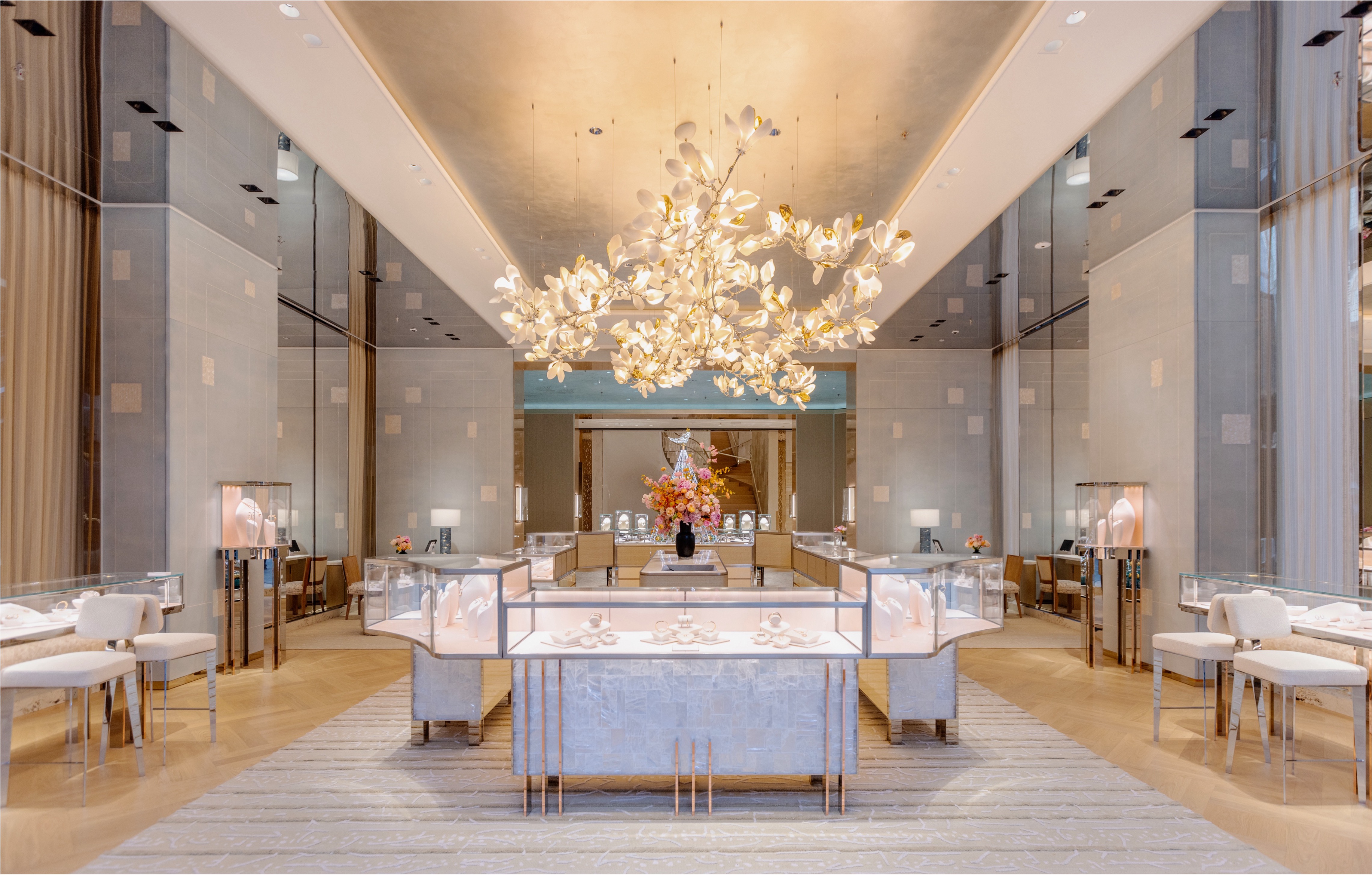 在店铺一层「蒂芙尼的世界」,宾客可尽情探索品牌钻石珠宝与经典作品。店内致敬成都活力与文化的设计元素亦比比皆是,璀璨枝形吊灯以成都当地木兰花为灵感,为一层空间带来明亮而不失自然气息的氛围。